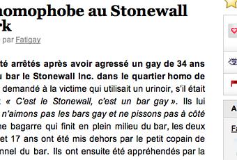 L’article Agression homophobe au Stonewall de New York publié le 6 octobre sur Fatigay a été sélectionné par le site Paperblog.