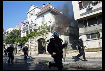 Un groupe d'éléments incontrôlés a vandalisé le siège du Parti démocratique (DS) du président Boris Tadic, provoquant un incendie vite maîtrisé. D'autres ont incendié des bennes à ordures ou brisé des vitres de voitures.