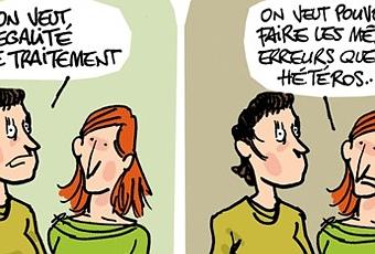 Titré « j’ai rencontré l’homophobie », mon soucieux camarade relate les propos lus et/ou entendus de-ci delà au gré des rues et de son surf quasi permanent sur la toile virtuelle, sur les propos acerbes de nos amis NoLife, antis-tout, frontistes ou nostalgiques du renouveau national. Il prévient les âmes sensibles, tolérantes ou homosexuelles (au choix), du déballage de haine qui ne manquera pas de s’étaler lorsque les grandes manœuvres pour l’égalité de tous auront débutées.
