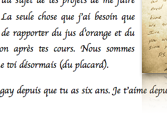 J’ai entendu ta conversation téléphonique avec Mike la nuit dernière au sujet de tes projets de me faire ton coming-out. La seule chose que j’ai besoin que tu prévoies, c’est de rapporter du jus d’orange et du pain à la maison après tes cours. Nous sommes sortis, tout comme toi désormais (du placard).